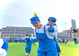 五星红旗飘扬在湛蓝的天空中,那片红属于你,那些闪亮的星星属于你。现场全体人员肃立,向国旗庄严致敬。踏着春天的脚步,踩着春天的节拍,老师、家长和宝贝们身着工、农、兵三式服装,在激昂的音乐中迈着整齐的步伐拉开了热闹欢快的革命大生产活动序幕。
